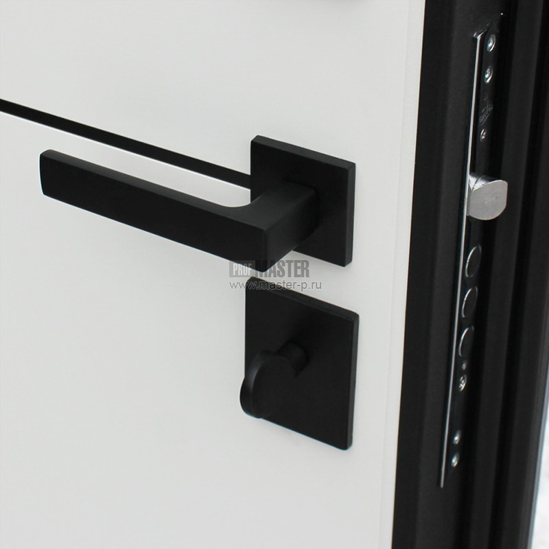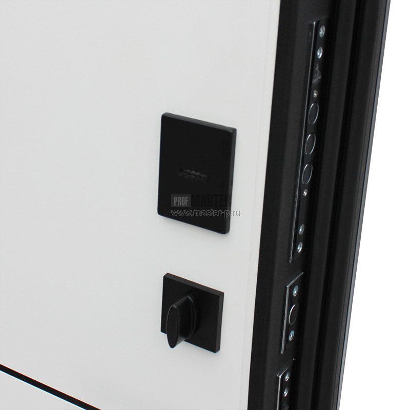 Броненакладка врезная, штырь противосъемный -3 шт., на сувальдном замке накладки со шторками автомат. Наличник с 3х сторон черный. Эксцентрик-регулятор притвора. |