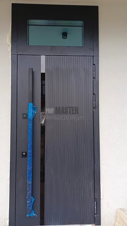 Заказная термодверь с верхней остекленной фрамугой, электронным замком и бугельной ручкой. -