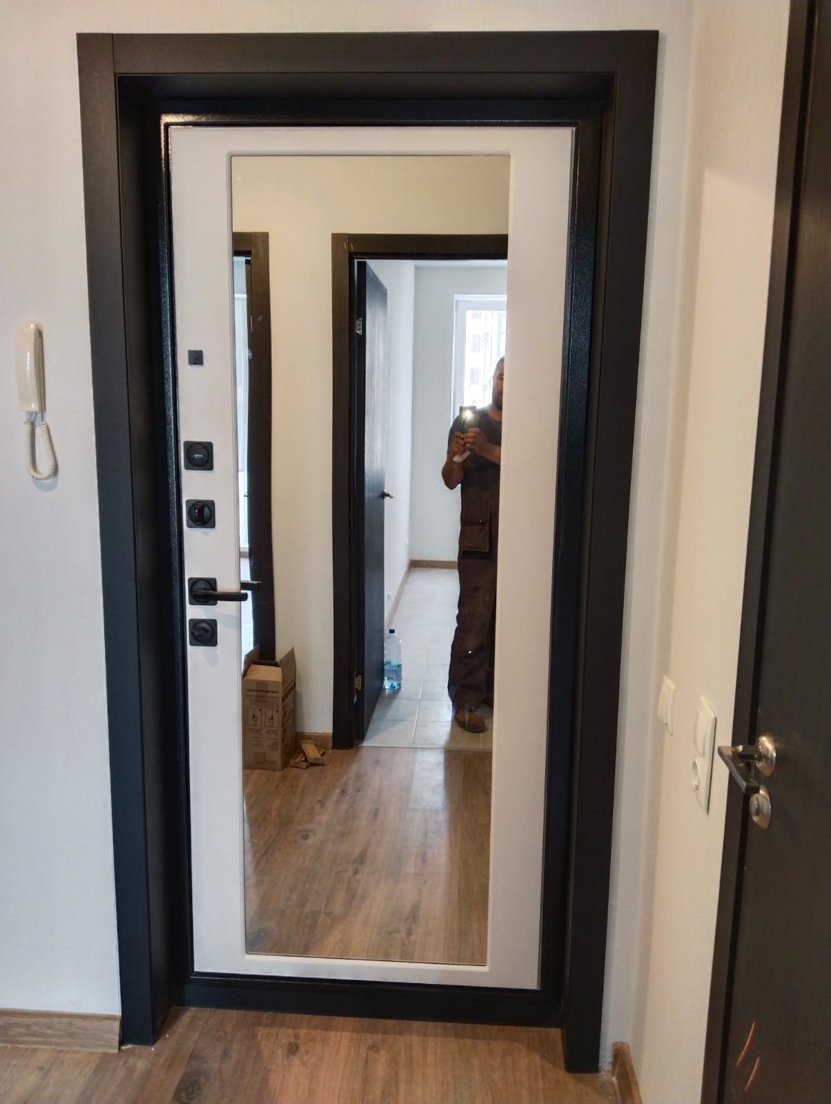 Выглядит дорого-богато, хотя в принципе и стоит соответствующе. Хорошо, что была на складе нашего размера в наличии, ждать долго не пришлось. Дверь трехконтурная, с электронным замком и функцией распознавания лиц, очень современное решение. Есть и обычный замок, так что дверь очень надежная. Дополнительно установили нам приложение, можем открывать дверь дистанционно, когда нас нет дома. Очень нужная и полезная функция в нашем мире.