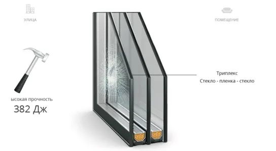 Использование триплекса (2-х слойного стекла) в составе 1-но камерного или 2-х камерного стеклопакета обезопасит вас, детей, и ваших гостей от осколков, которые могут образоваться при разрушении обычного стекла. Триплекс имеют специальную армирующую пленку между двумя стеклами, что значительно увеличивает ударопрочность, шумоизоляцию а также предотвращает распространение осколков при внештатной ситуации.