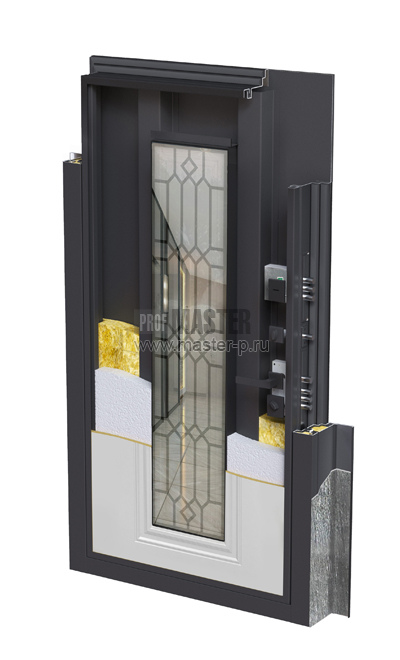 Три петли, эксцентрик на косой ригель с защитой рамы от потертостей. Шторки автомат. Порог нерж сталь. Увеличенный металлический наличник 100 мм |