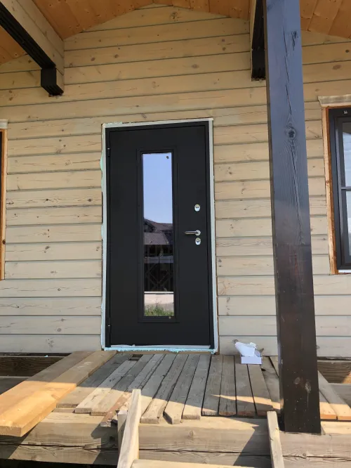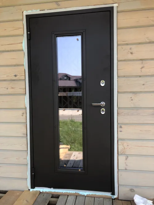 Дверная коробка: утепленная, усиленная профильная конструкция октрытого типа с терморазрывом. Дверное полотно: усилено ребрами жесткости.