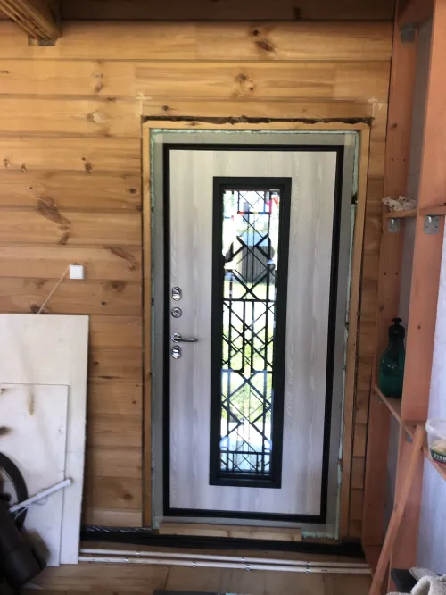 Входная уличная дверь с терморазрывом со стеклом идекоративной решеткой.