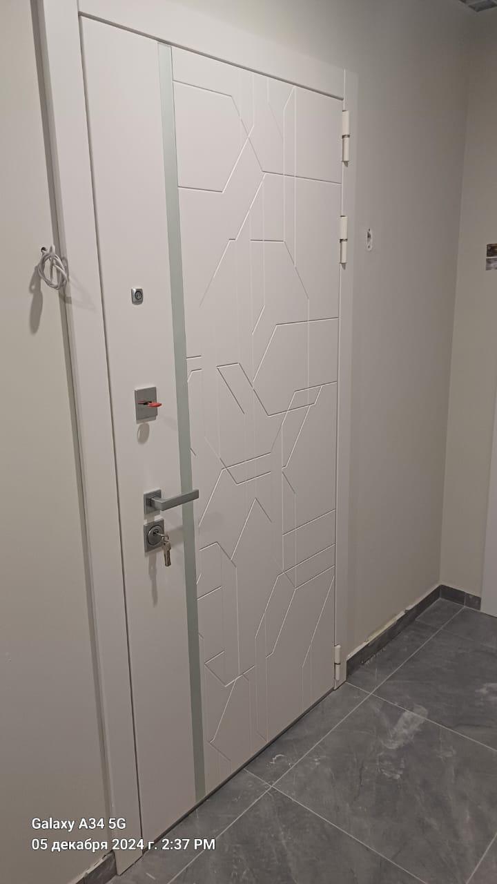 Современный внешний вид, рама белая матовая, вставка матвое стекло лакобель. Фурнитура на квадратном основании.