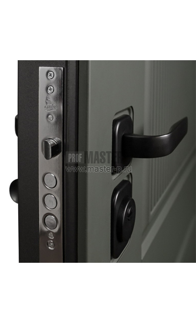 Броненакладка врезная, штырь противосъемный -3 шт., на сувальдном замке накладки со шторками автомат. Наличник с 3х сторон сталь +мдф черный. Эксцентрик-регулятор притвора. Рама черный муар. |