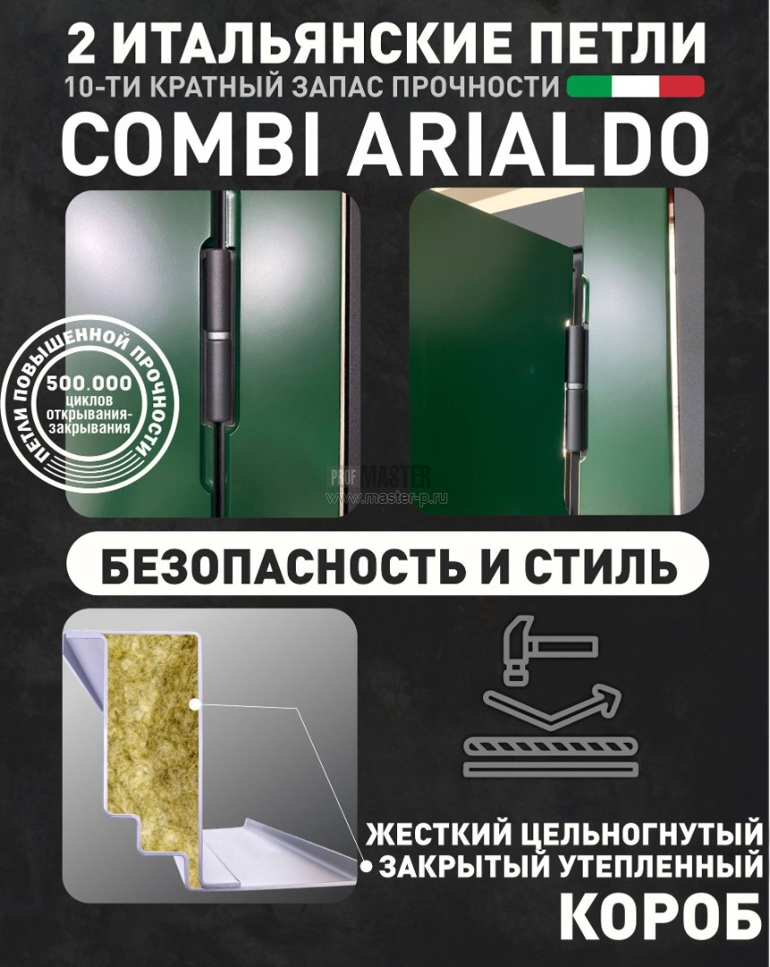 Легкий ход довольно тяжелого полотна обеспечивают петли Итальянского производства Combiarialdo. Петли усиленные, гарантированно выдерживают тяжелые полотна, при этом их в отличии от большинства производителей на двери всего 2шт. Продукция сертифицирована.