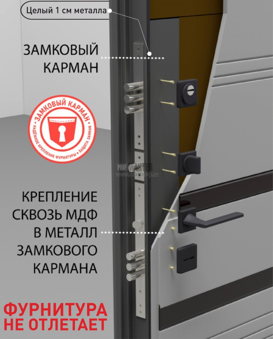 Предусмотрена защита ригелей от взлома методом отжима. Замковый карман для дополнительного крепления замковых механизмов.